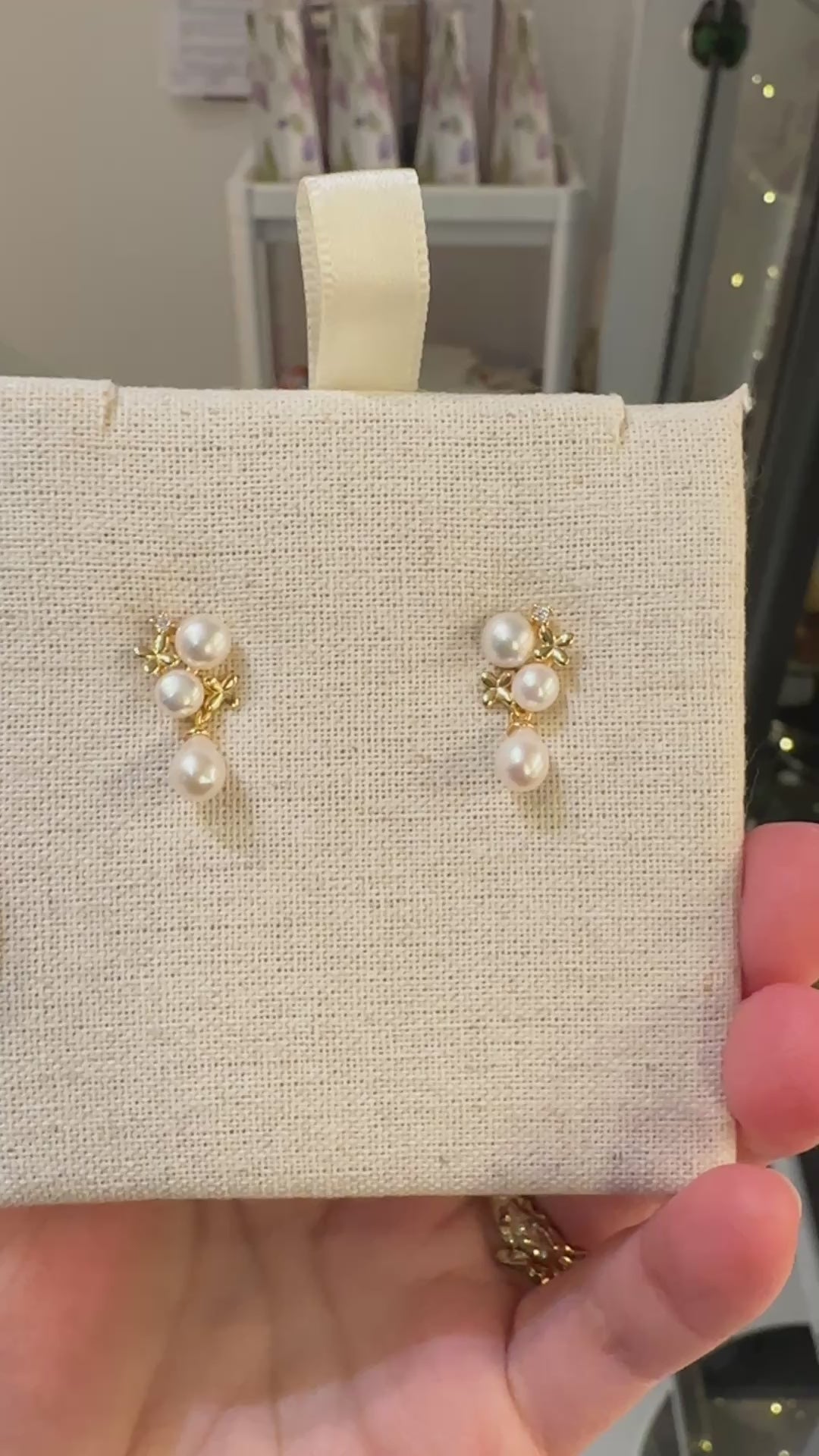 18k gold plated silver, each piece with three premium quality Aurora Pearl. Natural pink hue